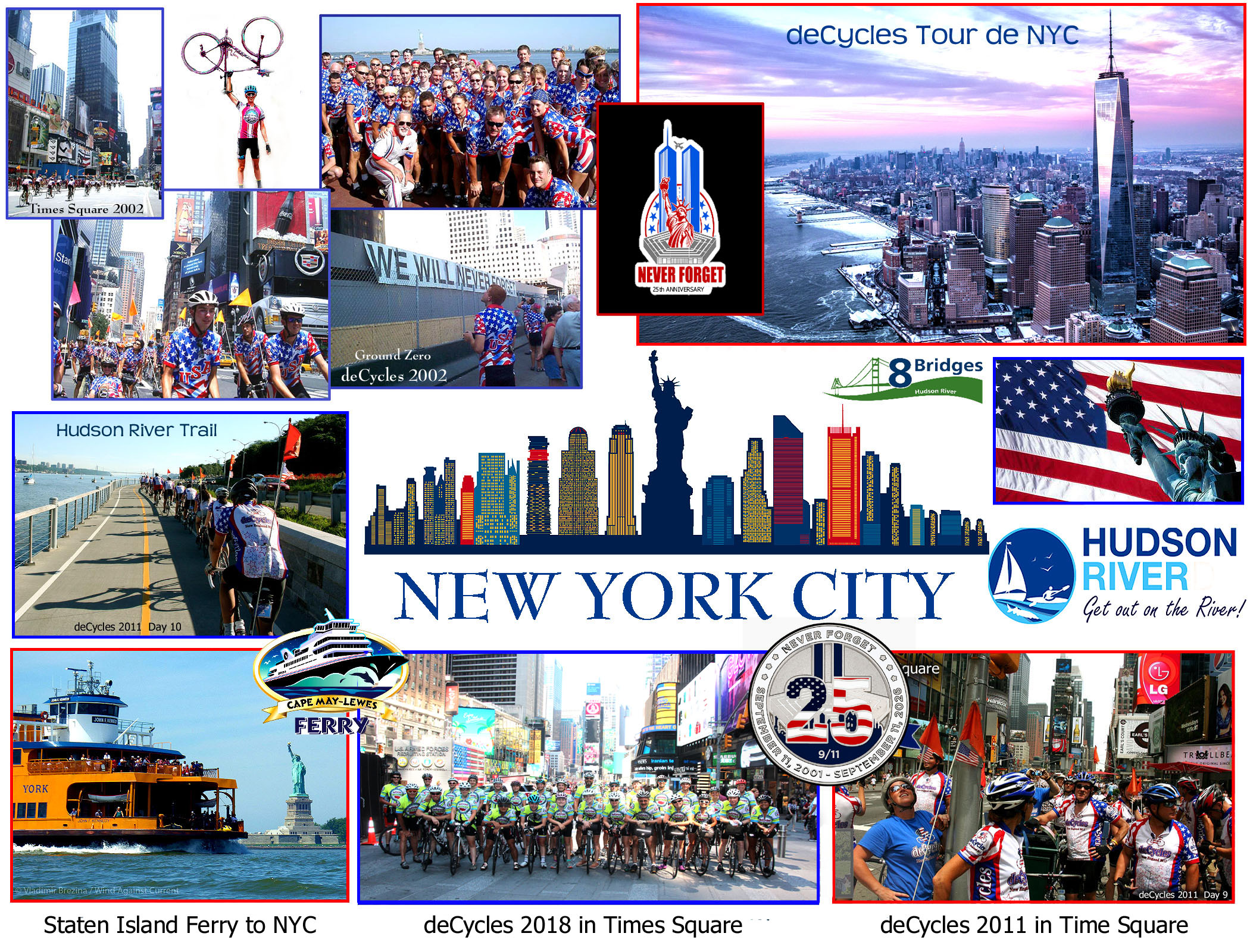 The trip begins in Bloomington, Indiana, the home base of deCycles and most recently the 2025 national collegiate football champions. The first week the group will cycle through Kentucky & West Virginia and a whitewater rafting excursion on the famous New River. The second week will continue through Shenendoah Valley, Blue Ridge Parkway, beautiful Virginia and Washington DC during the 4th of July weekend on America’s 250th Anniversary. We have applied for participation in the national parade and tours of the White House and U.S. Capitol Building. The final weekend pushes to the Atlantic Coastline, Atlantic City, and the final destination of NYC where the deCycles will pay tribute to the 25th Anniversary of 9/11 at the World Trade Center. Everyone will be bussed back to Bloomington at the conclusion of the trip. Wow, you can’t find a better 3-week high adventure trip loaded with spectacular scenery and historical significance all for just under $19/day.
